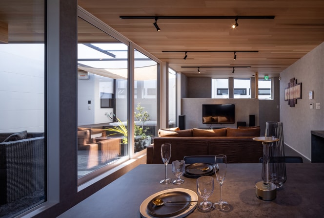 大切な愛車で玄関までアクセスできる、インナーガレージ付きのプレミアムなホテル。1階に客室×3部屋、2階が大空間のスイートルームで、そのままオープンエアのスカイテラスへ。